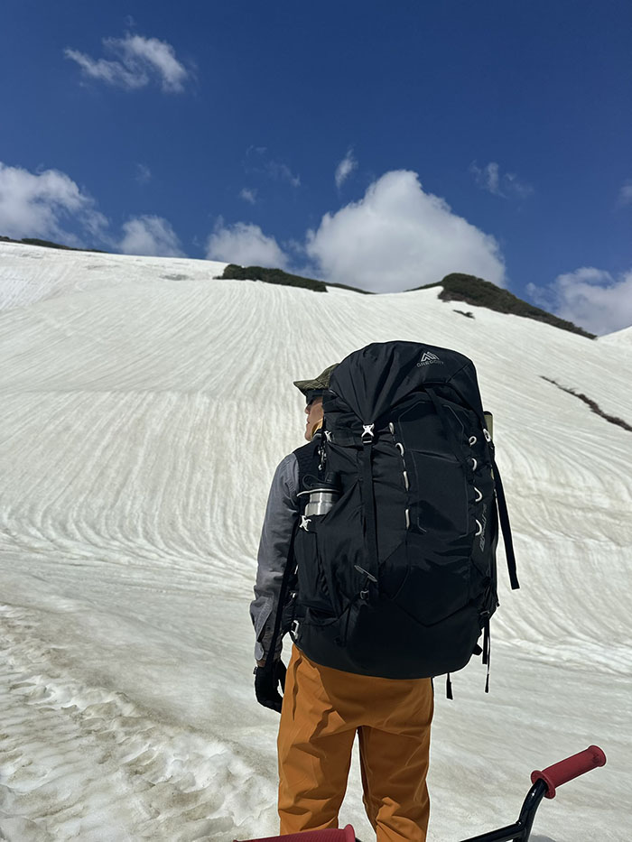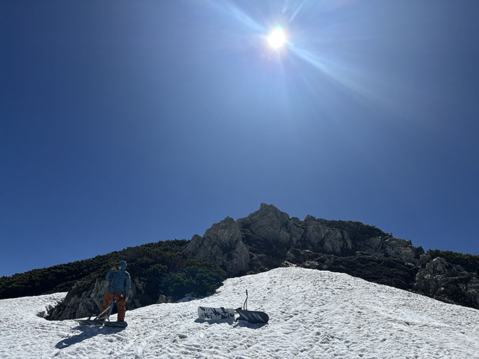 2500m~3000mのアルパインには積雪はまだまだ。尾根沿いなどは登山道が露出していますが、斜面はほぼ全面滑走可能という雰囲気