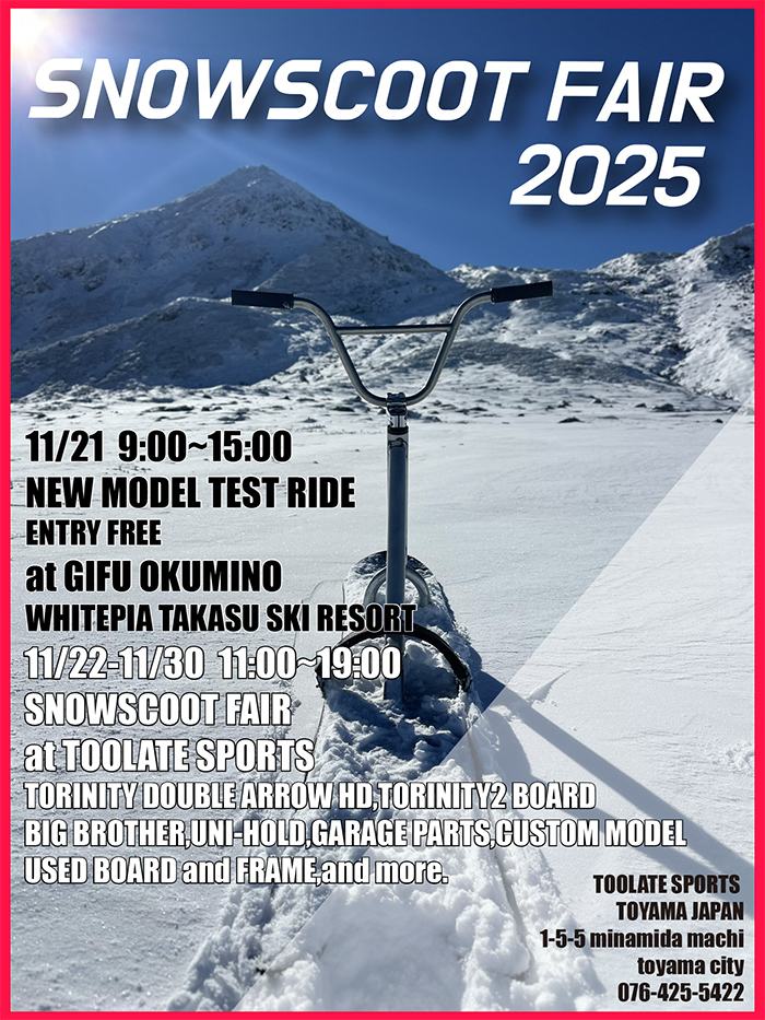 トウーレイトスポーツでは今年もシーズンインに向けてスノースクート用品ニューモデルやガレージセール、スクートフェアを開催致します。11/21はホワイトピアで無料試乗会も開催します、ニューモデルに乗ってみたい方はぜひ当日は現地にお越し下さいませ。