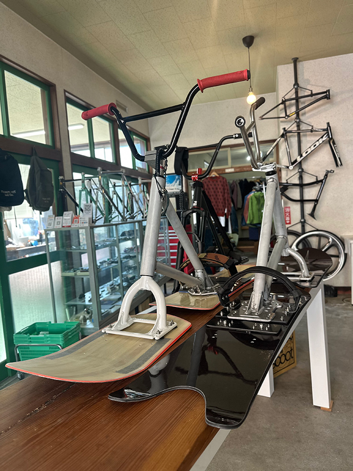 -試乗スクート AR,トリニティダブルアロー、トリニティ2ボードプロトタイプ、スノーバイクテックユニホールド、T3フレームなど