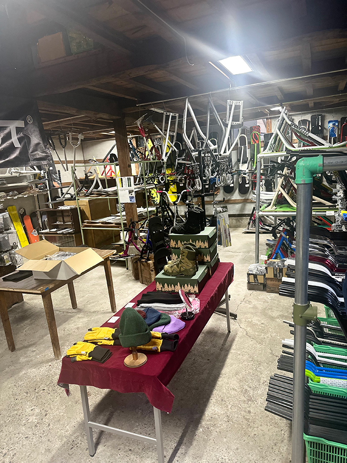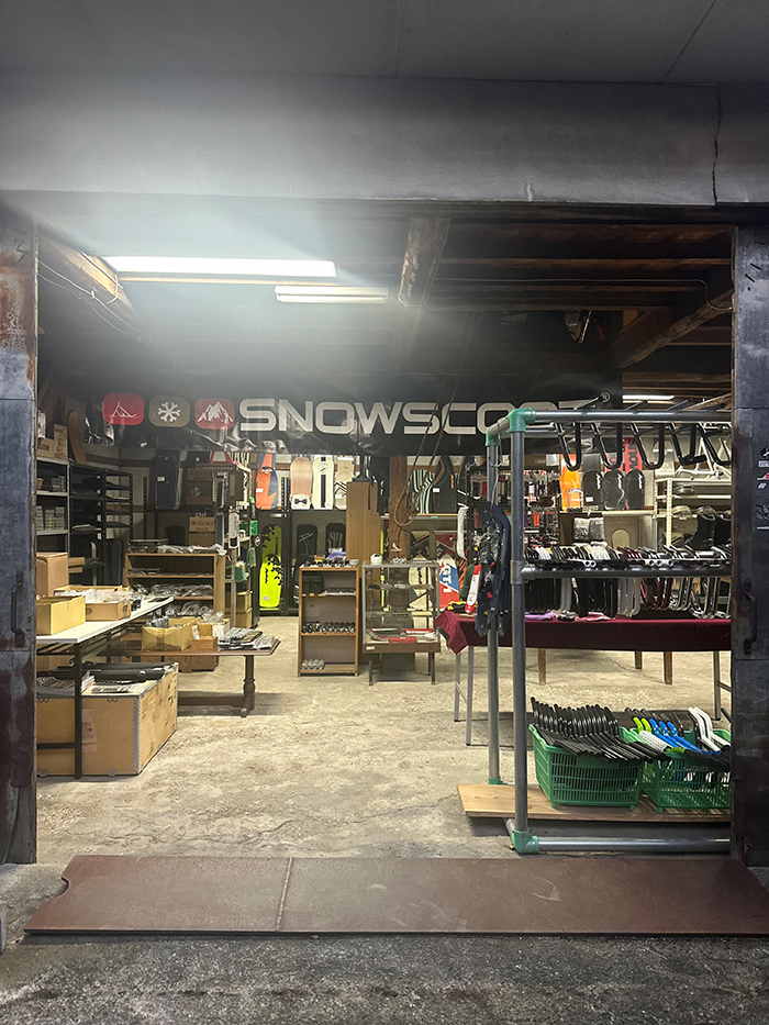 トウーレイトスポーツの奥にある「蔵」ゾーンは世界のスノースクートギアが揃う展示場に