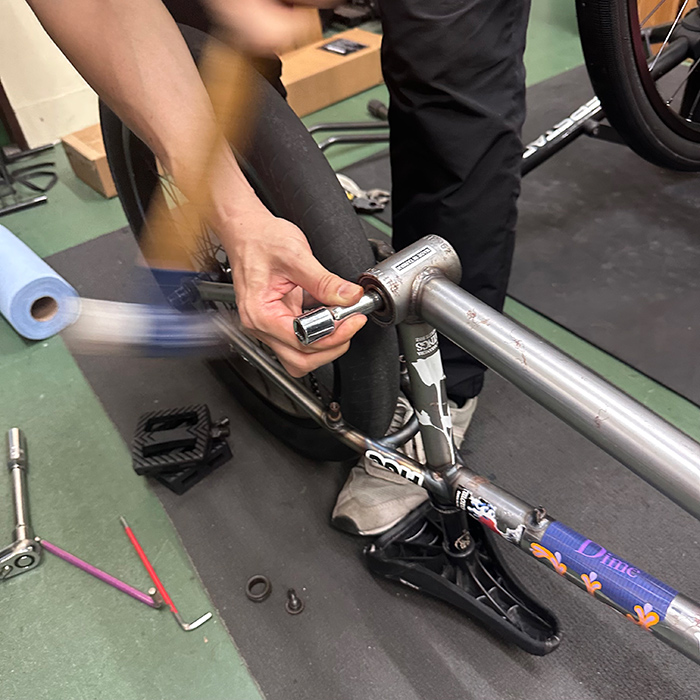 まずはBMXのBB、クランク交換。BMXならではの規格がありますが基本は叩いて外し、叩いてつける。