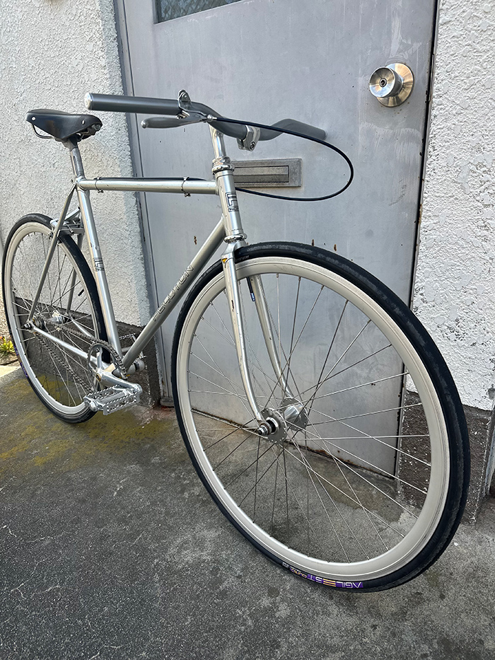 中古競輪フレームをベースに太タイヤ、シングルフリー、フラットペダルと今っぽさと惰性感全開の一台。シルバーがかっこいいピストフレームになりました。