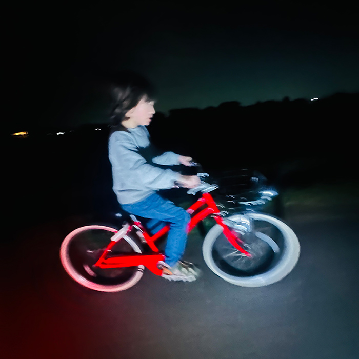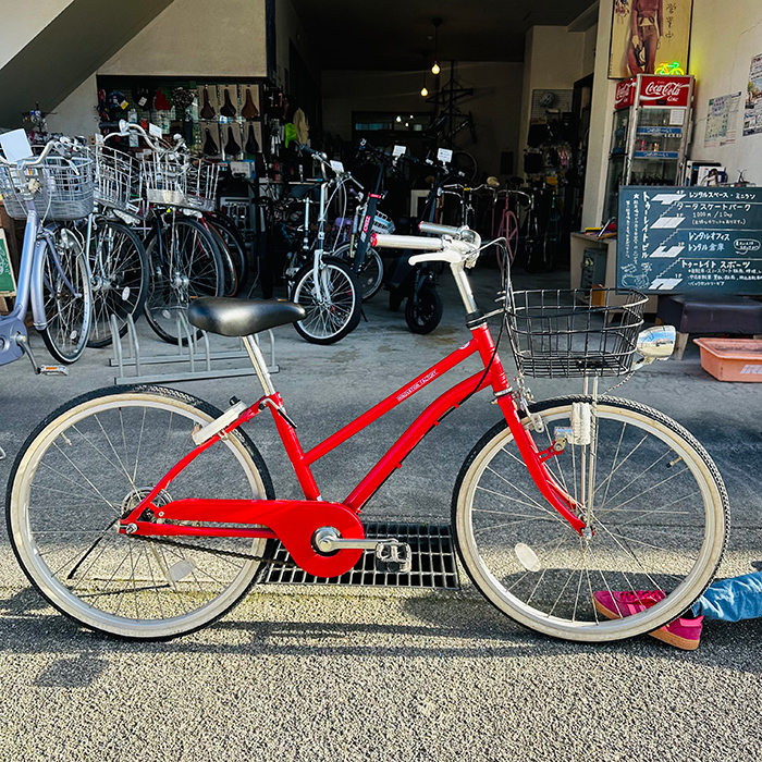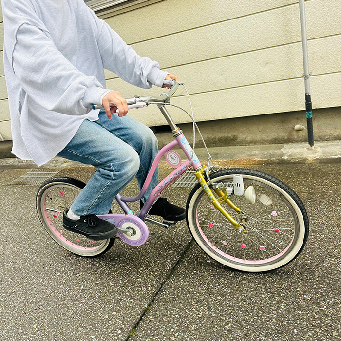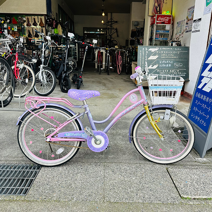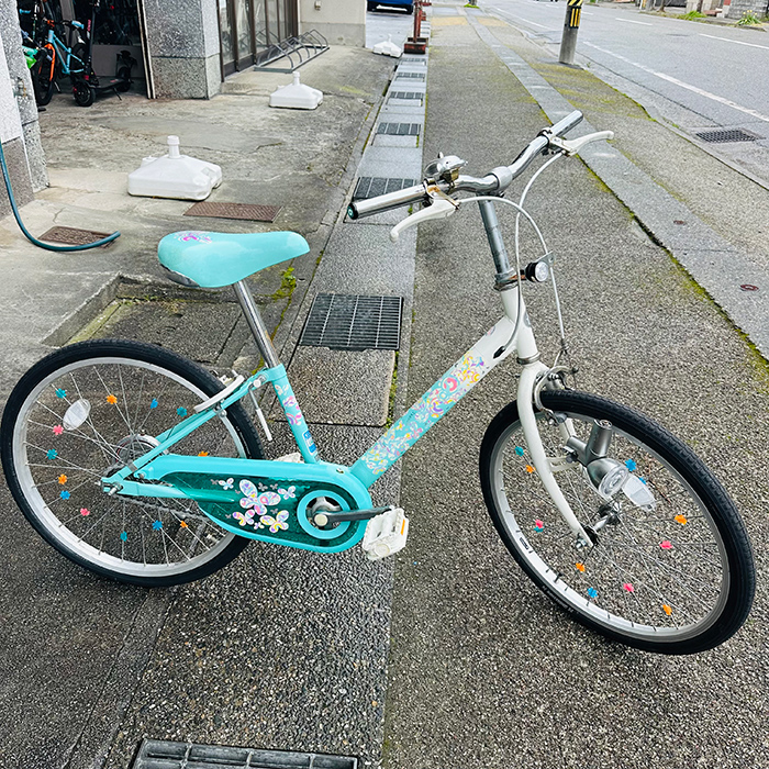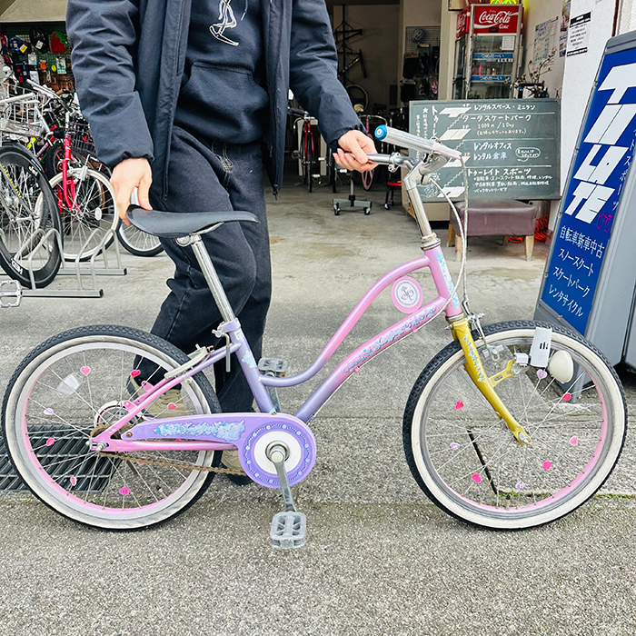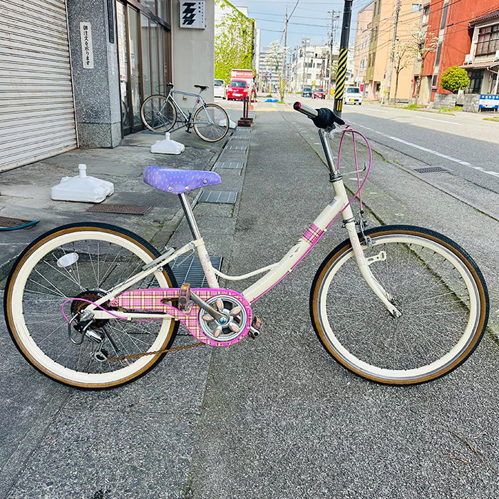 ↑これが元々の20インチガールズ自転車、再整備してフェンダーやカゴを丁寧に外し、すっきり仕上げたらポジション調整、