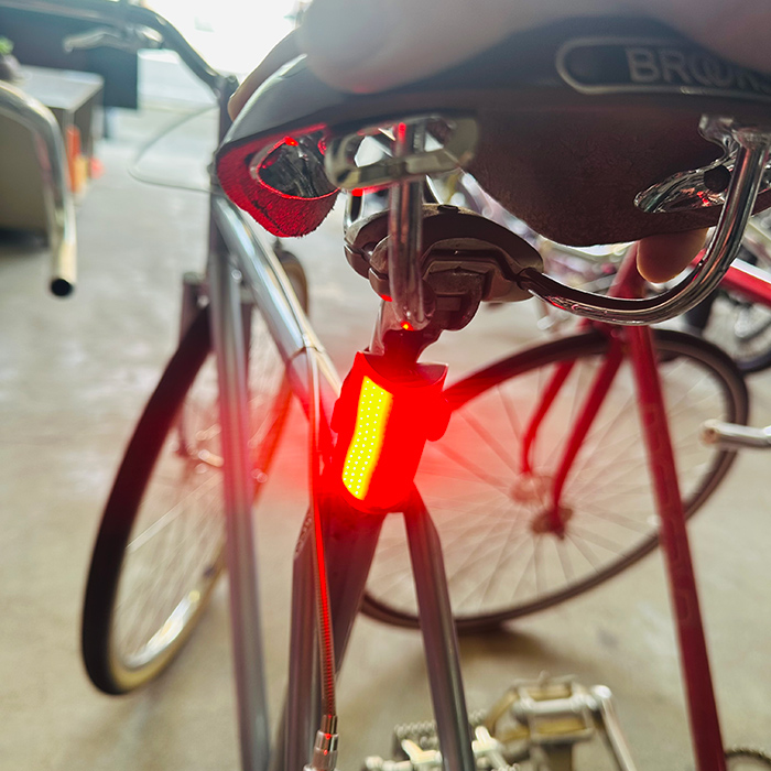 なんと、自転車の傾きに応じてウインカーのように光が移動するディレクション機能、ブレーキをかけてスピードが減速するとテールライトが強く光るブレーキング機能など、自転車ライトもここまで来たか!と驚きのモデルです。