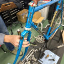 こちらはクロモリサーリーのクランク交換、最新規格に揃えてアップデート。規格ごとに専門工具の数が増えていくのがなんとも最近のMTB事情です